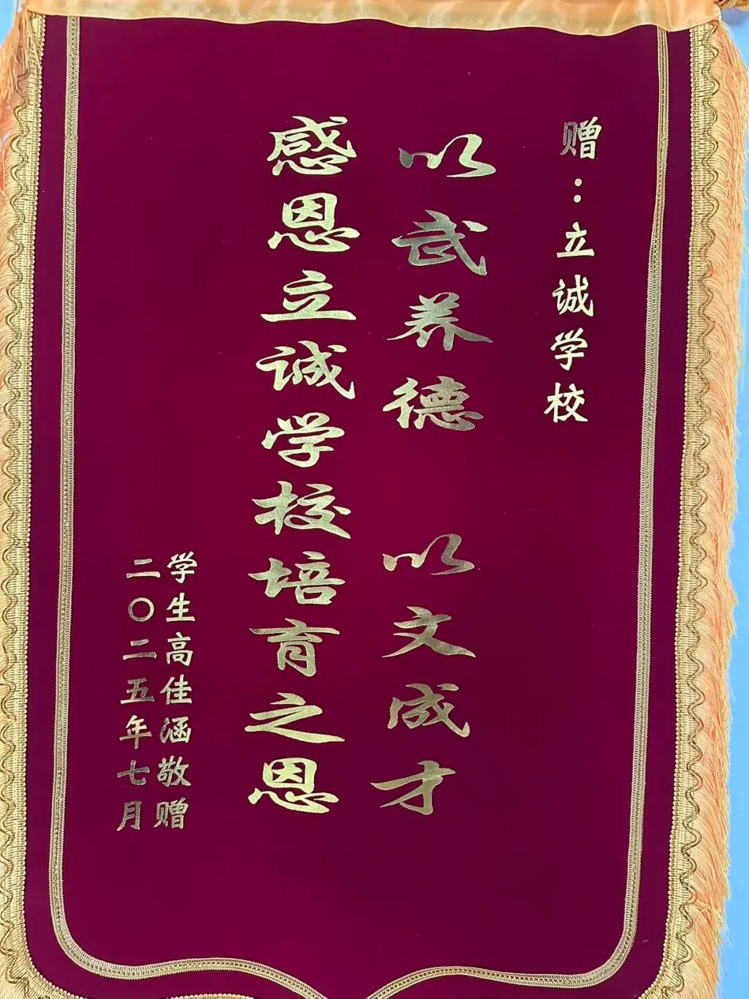 开学初,我校2025武术体育单招毕业学生高佳涵、邱子淳手持面绣有名校风范育栋梁 恩师教诲铭心间以武养德 以文成才 感恩立诚学校培育之恩的锦旗,专程到母校表达诚挚谢意。