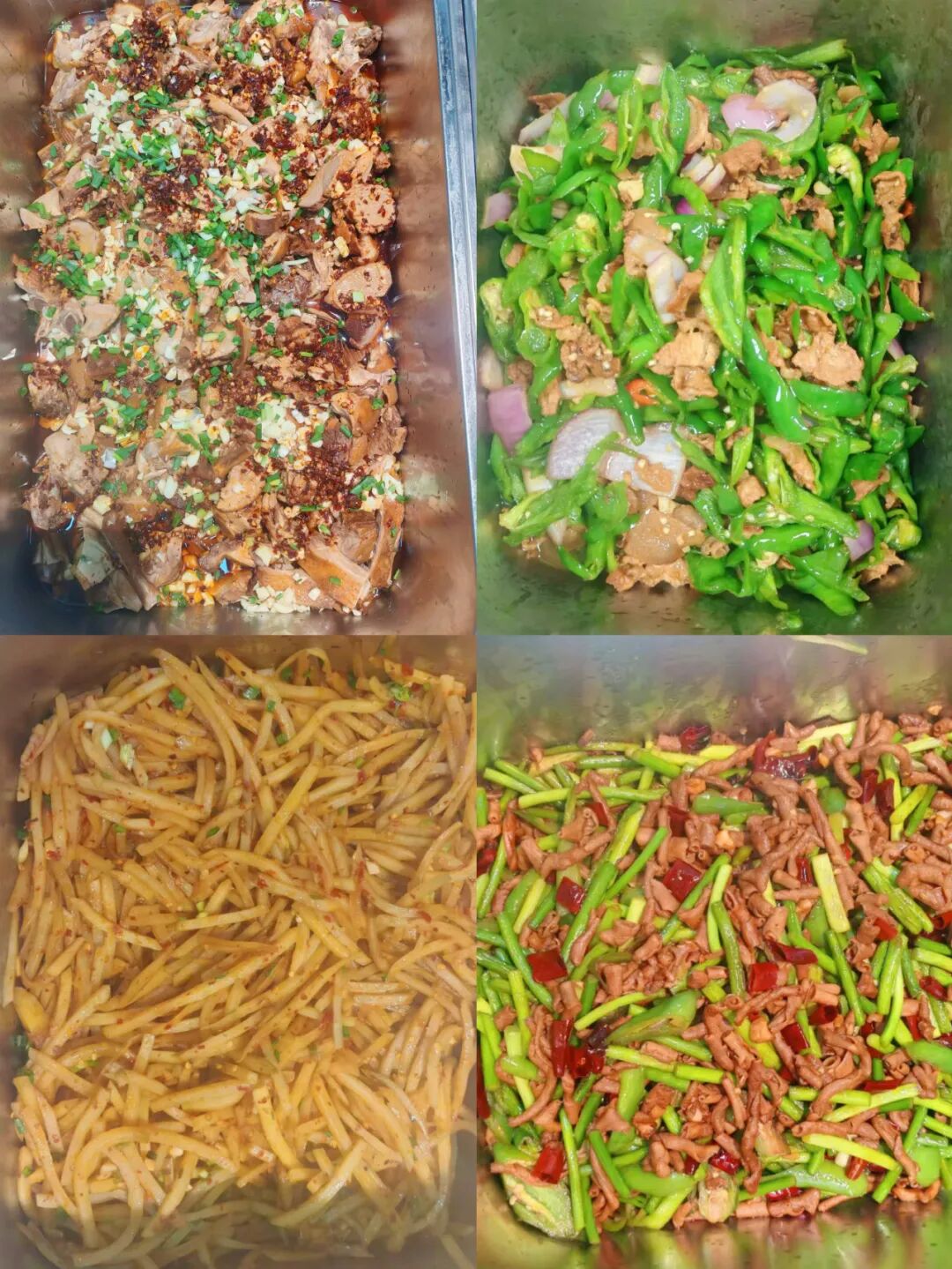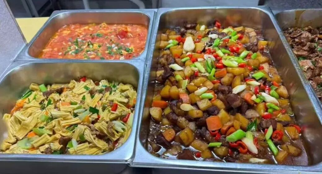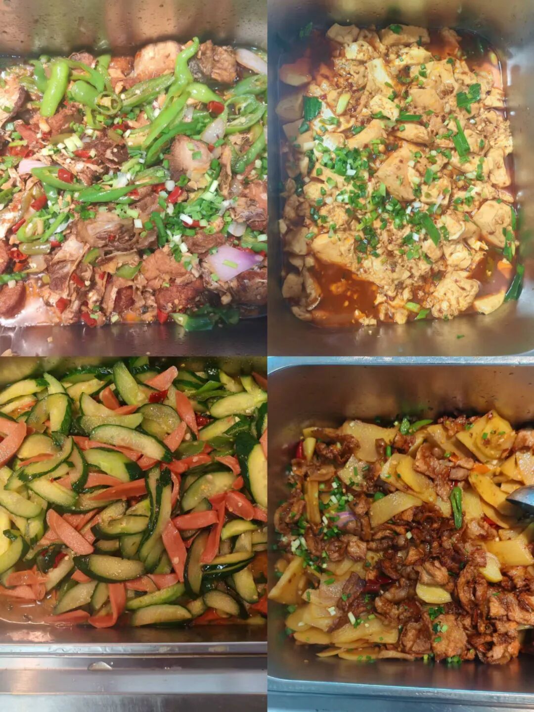 中餐:辣子鸡、辣椒炒肉柳、炸鸡排、红烧鱼、蒜薹炒肉、爆炒猪肝、西芹炒肉、木耳炒肉、凉拌莲藕、大白菜、三鲜汤