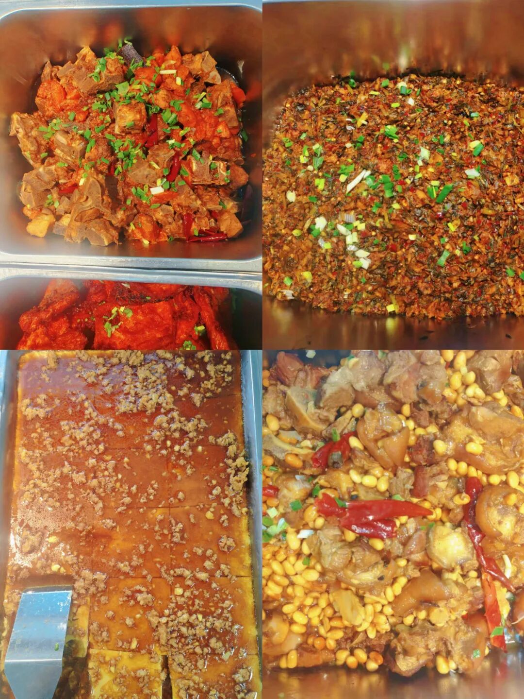 中餐:啤酒鸭、炸小酥肉、红烧肉烧鹌鹑蛋、辣子鸡、豆干烧肉、豆角炒肉、花菜炒肉、冬瓜炒肉沫、清炒豆皮、包菜、冬瓜汤